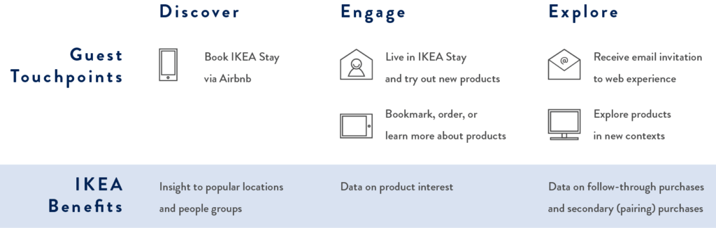 The concept: visitors stay at short-term Airbnb rentals furnished with IKEA products they can try in real living situations. A tablet in each home features the furnished products which guests can save for later review. A post-stay website allows customers to purchase products they loved and explore how those same items look in other home contexts.